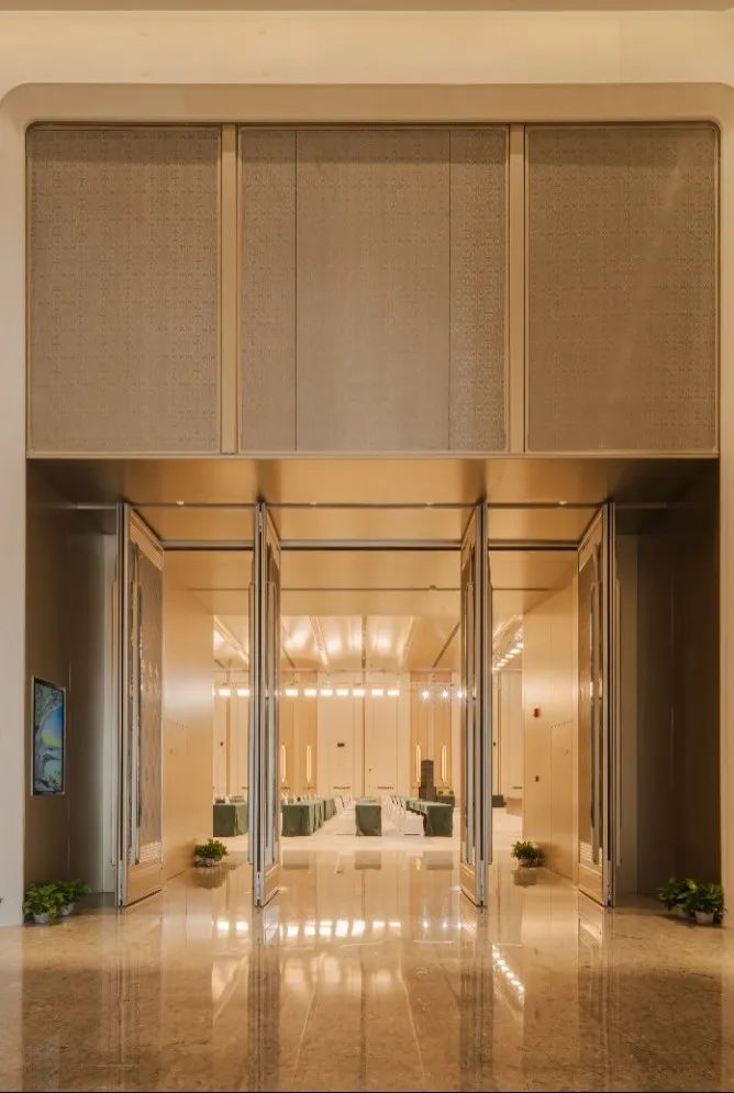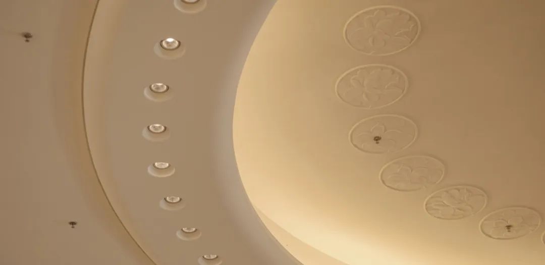會議中心前廳頂面采用25朵花代表澳門回歸祖國25周年,造型中提取木棉花、蓮花寫意形體作為裝飾元素,圖案相互交錯(cuò),寓意“一國兩制”方針下粵澳共商、共建、共管、共享的新模式。